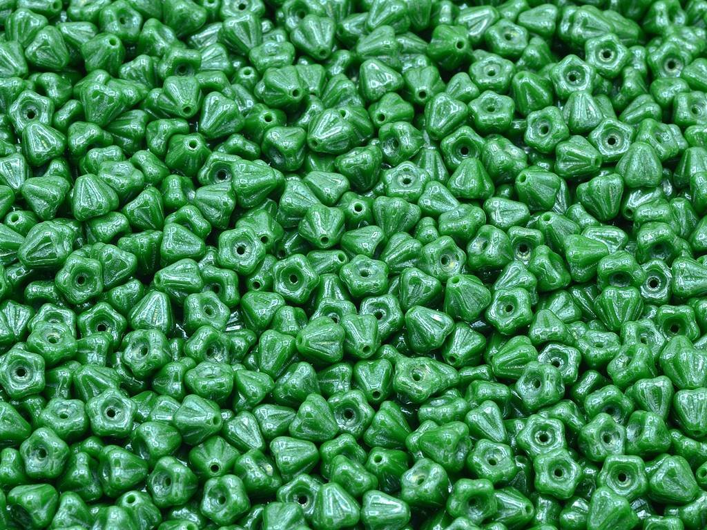 Czech glass bell flower beads, size 4x6 mm, package contents 60 pcs or is described below, color opaque greene with 14400 finish (shimmer).