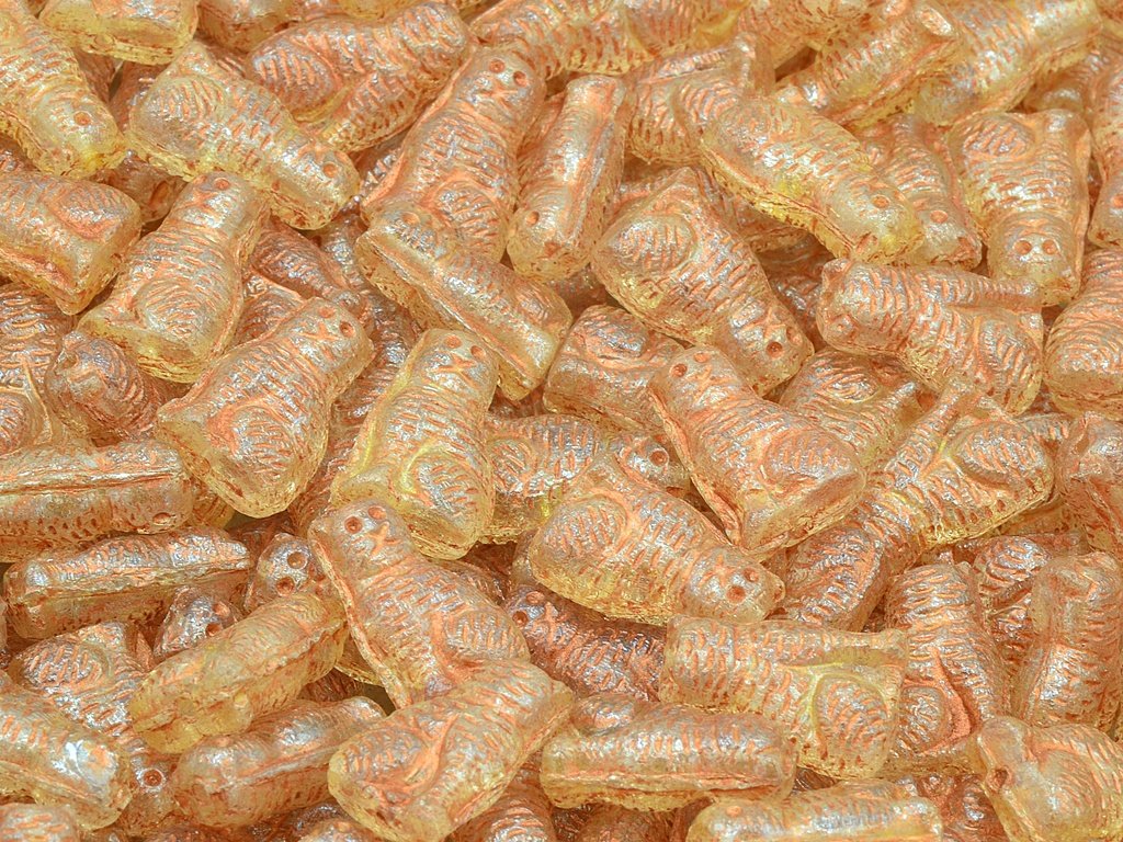Czech pressed glass beads in the shape of cat, size 16x10 mm, package contents 5 pcs or is described below, color crystal with 14483 and 54307 finish.
