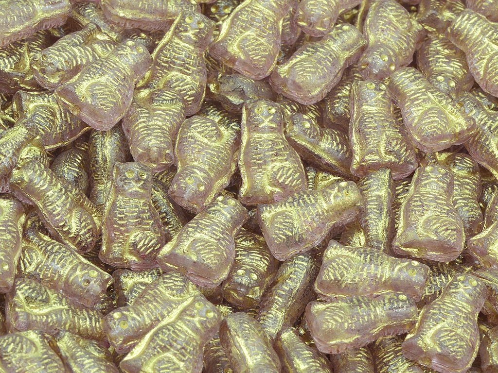 Czech pressed glass beads in the shape of cat, size 16x10 mm, package contents 5 pcs or is described below, color crystal with 34306 and 54302 finish.