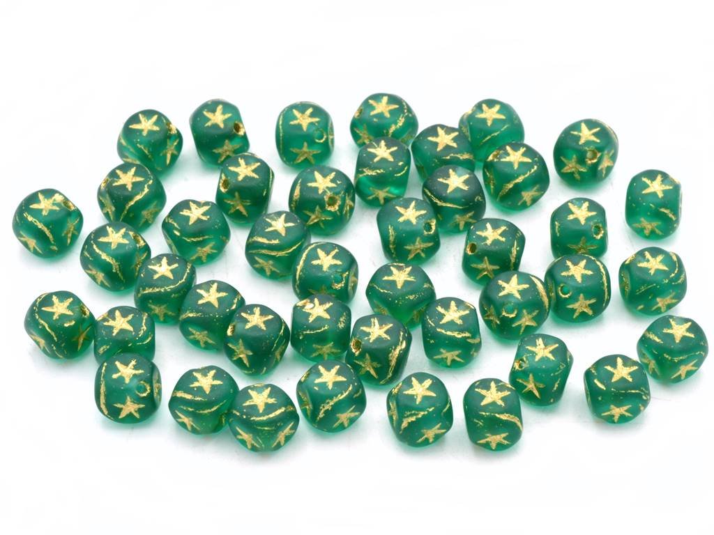 Czech glass beads in the shape of cube with relief of star, size 7 mm, package contents 30 pcs or is described below, color emerald matted with 54202 finish.