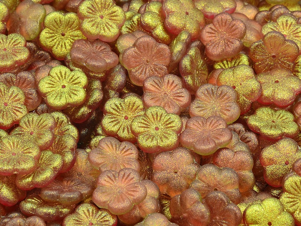 Czech glass beads in the shape of flower, size 14 mm, color crystal with 542015 finish, hole in the middle, package contents 10 pcs or is described below