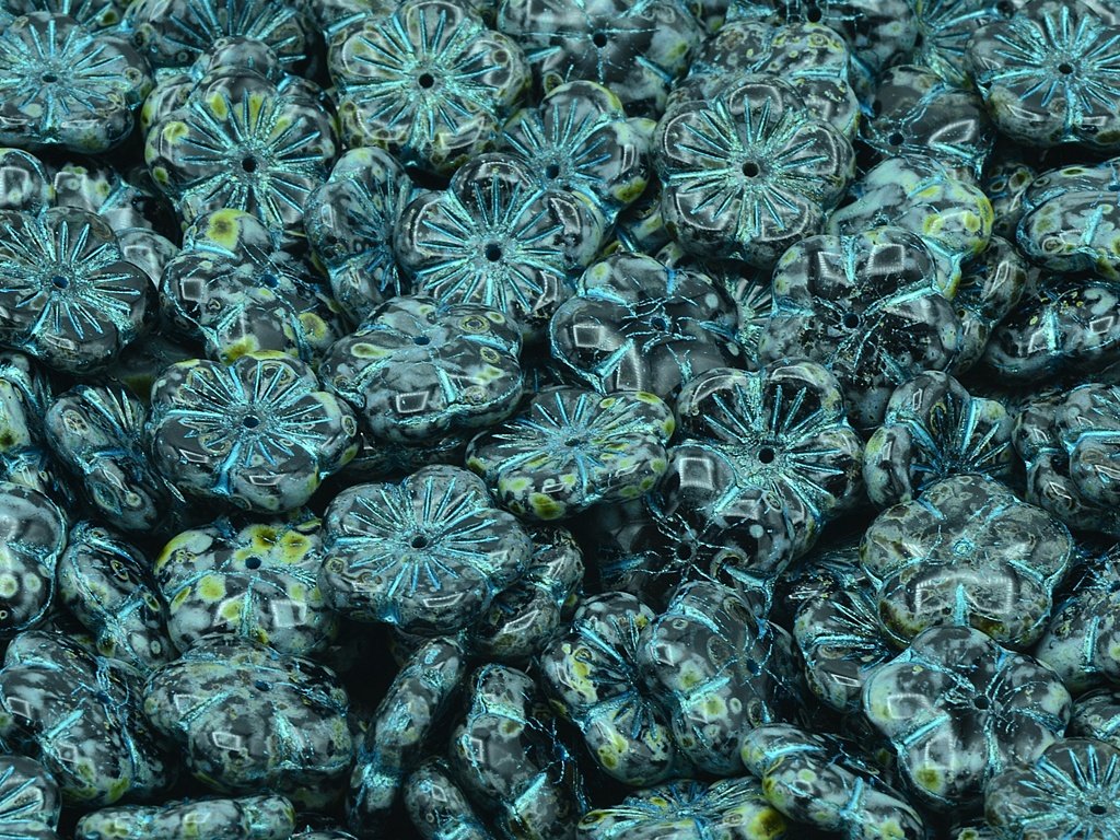 Czech glass beads in the shape of flower, size 14 mm, color jet with 86800 and 43811 finish, hole in the middle, package contents 10 pcs or is described below