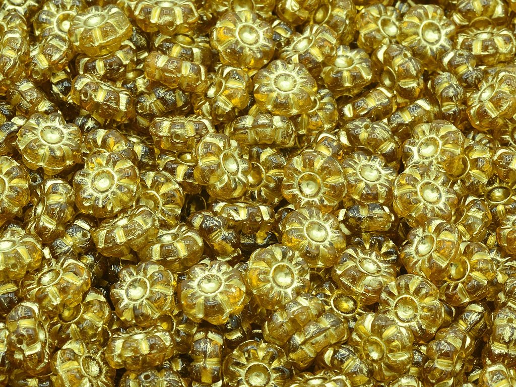 Czech pressed glass beads in the shape of flower, size 10 mm, package contents 15 pcs or is described below, color topaz with 54202 finish.