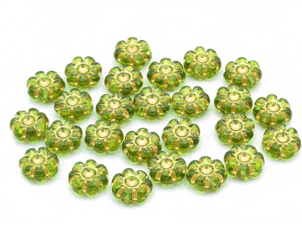 Czech pressed glass beads in the shape of flower, size 10 mm, package contents 15 pcs or is described below, color olivine with 54202 finish.
