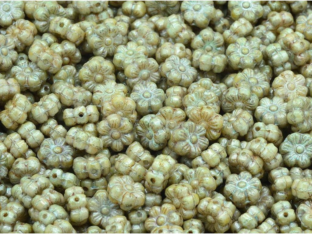 Czech glass beads in the shape of flower, size 8 mm, package contents 30 pcs or is described below, color chalk white with 65455 finish.