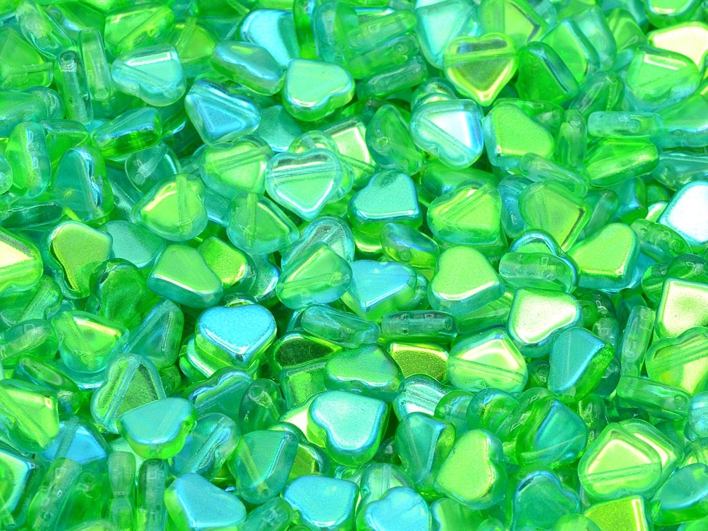 Czech pressed glass beads in the shape of hearts, size 9 mm, package contents 15 pcs or is described below, color crystal with 48110 finish.