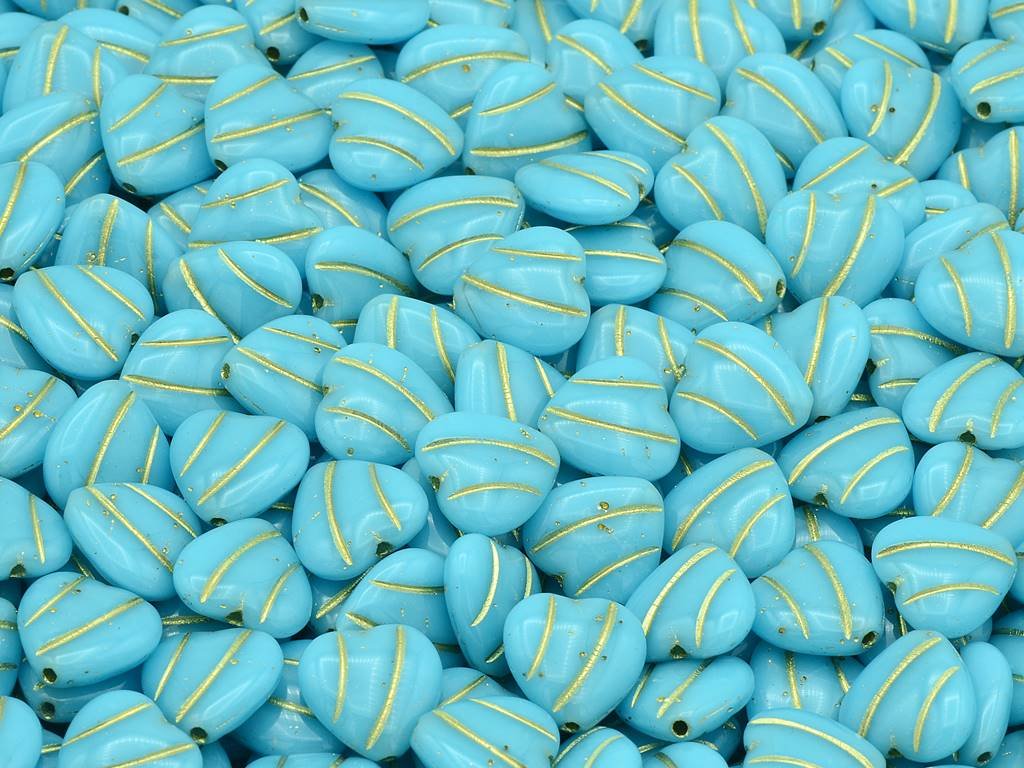 Czech pressed glass beads in the shape of heart with relief, size 10x10 mm, package contents 15 pcs or is described below, color turquoise with 54202 finish.
