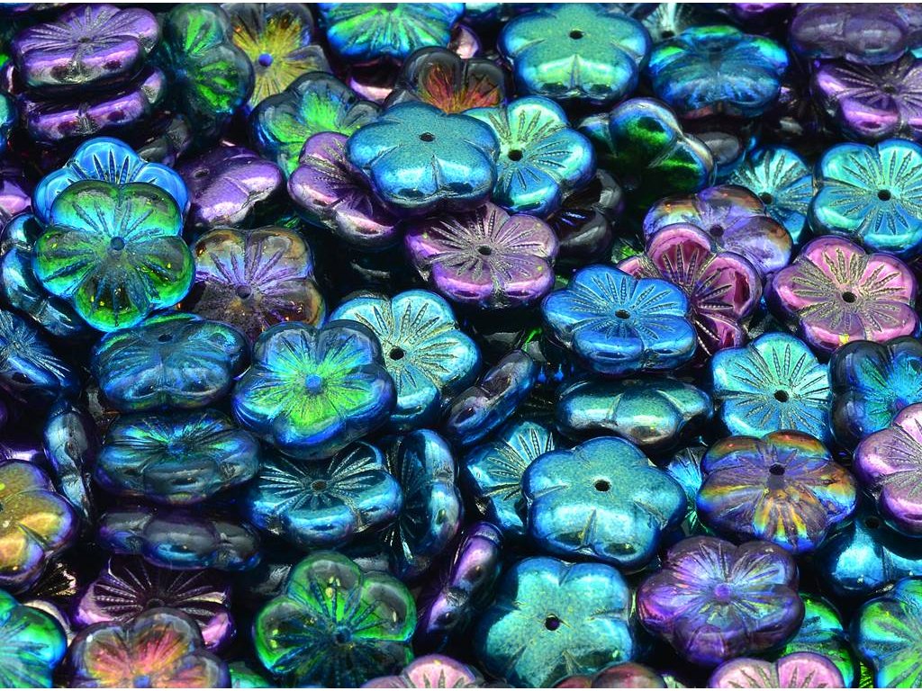 Czech glass beads in the shape of flower, size 14 mm, color crystal with 95100 finish (Magic Blue), hole in the middle, package contents 10 pcs or is described below