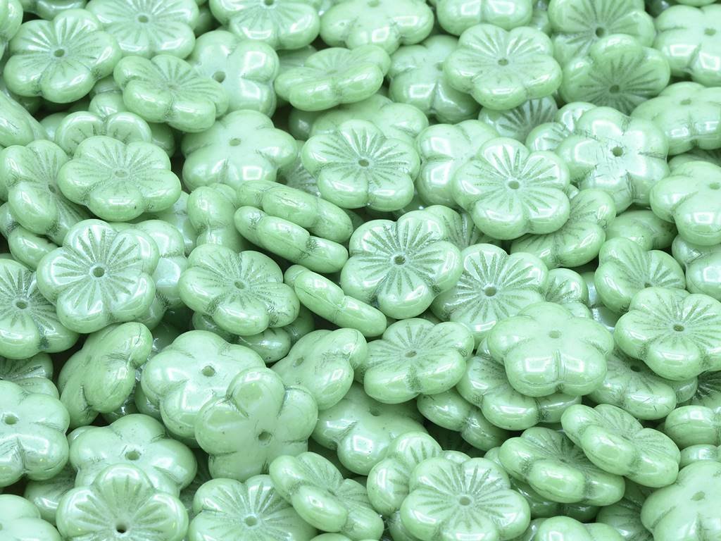 Czech glass beads in the shape of flower, size 14 mm, color chalk white with 14457 finish (Mint Luster), hole in the middle, package contents 10 pcs or is described below