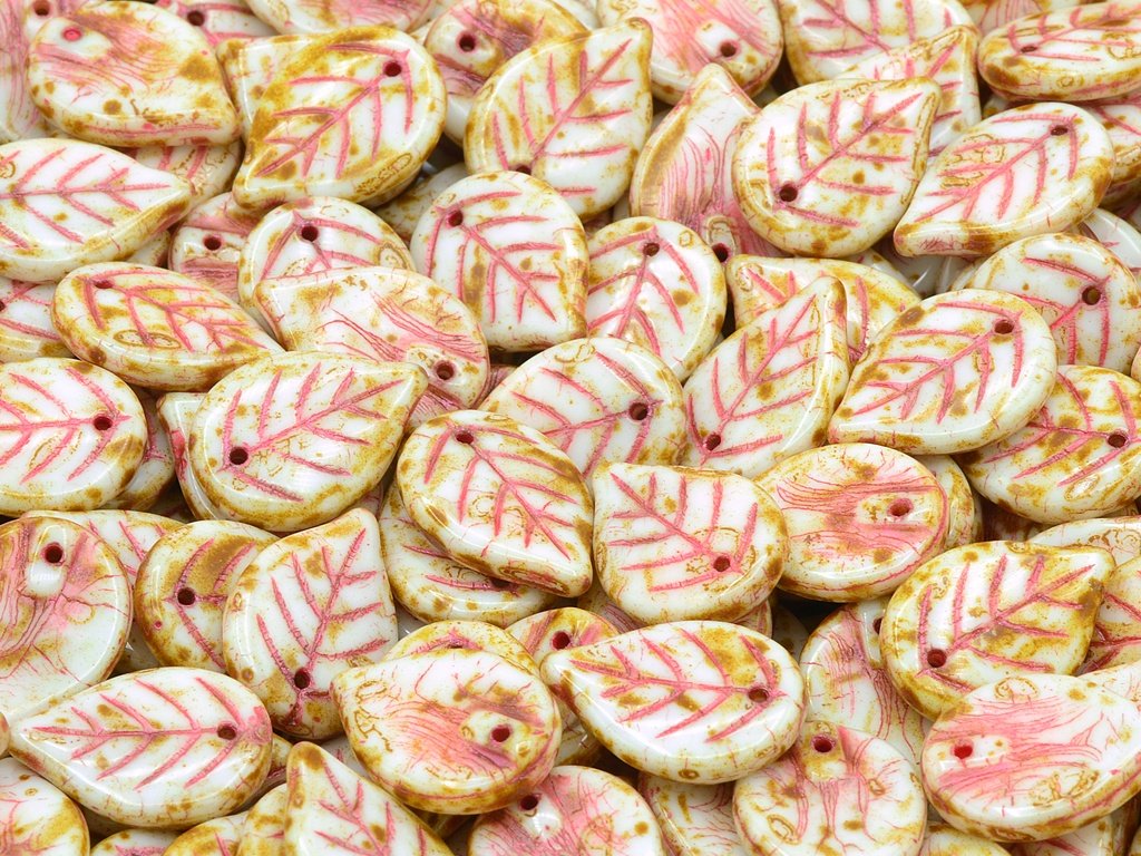 Czech glass beads in the shape of leaves, size 18x13 mm, package contents 5 pcs or is described below, color alabaster with 86800 and 43808 finish.