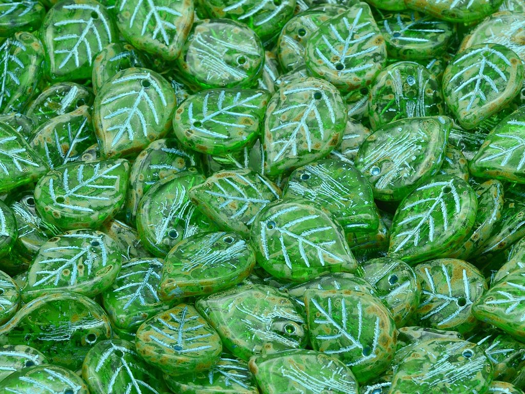 Czech glass beads in the shape of leaves, size 18x13 mm, package contents 5 pcs or is described below, color chrysolite with 86800 and 54308 finish.