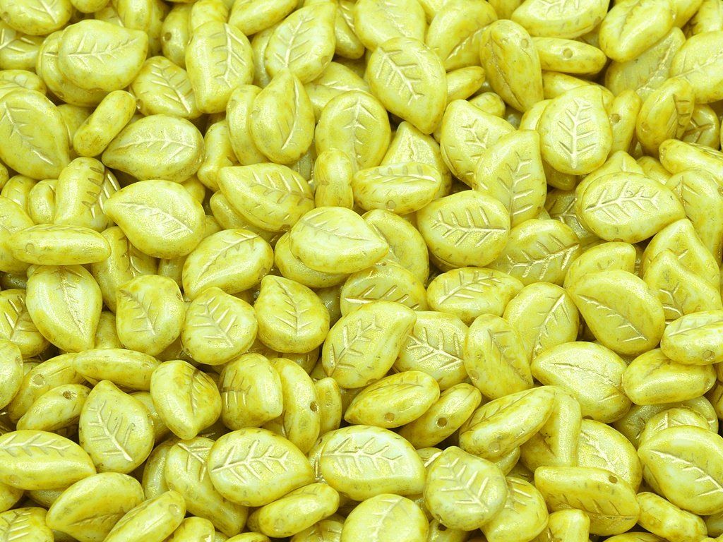 Czech pressed glass beads in the shape of leaf, size 12x9 mm, package contents 15 pcs or is described below, color chalk white with 54302 and 34302 finish.