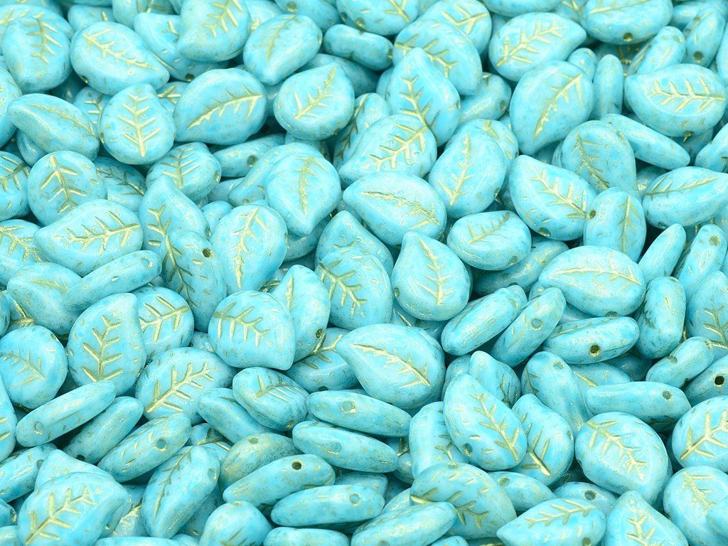 Czech pressed glass beads in the shape of leaf, size 12x9 mm, package contents 15 pcs or is described below, color chalk white with 54302 and 34308 finish.