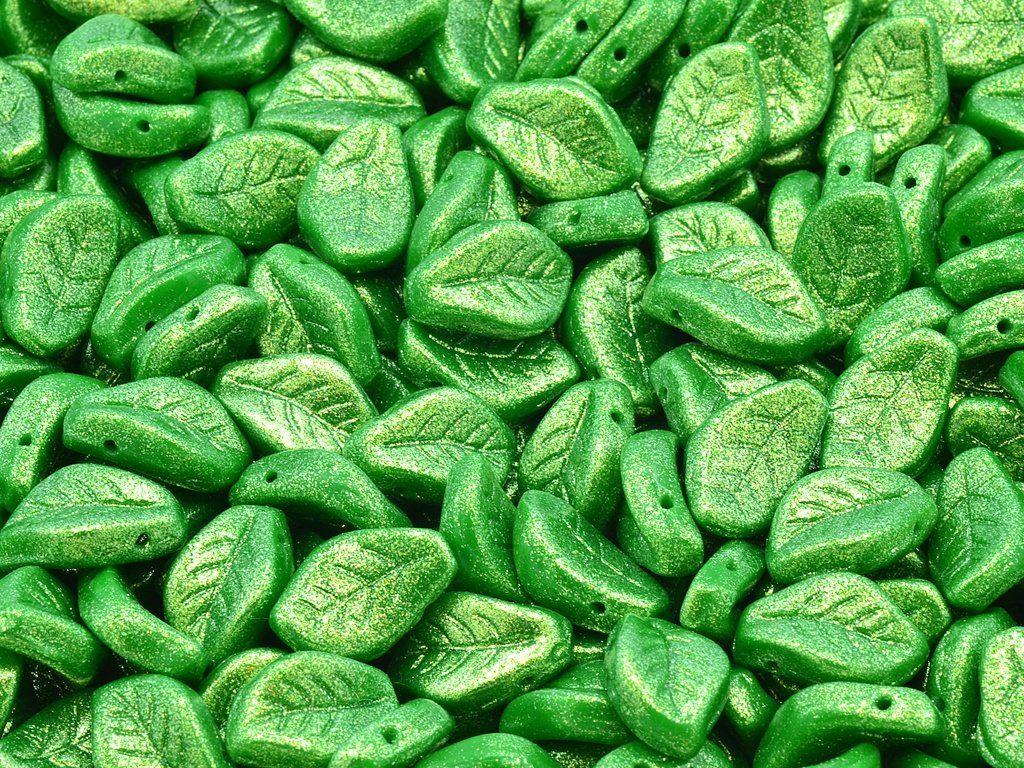 Czech pressed glass beads in the shape of leaf, size 9x14 mm, package contents 10 pcs or is described below, color opaque green with 12501 finish.