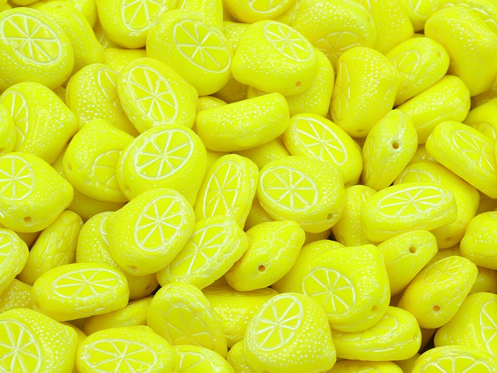 Pressed glass beads lemon shaped, size 15 mm, package contents 5 pcs or is described below, color limon with 54312 finish.
