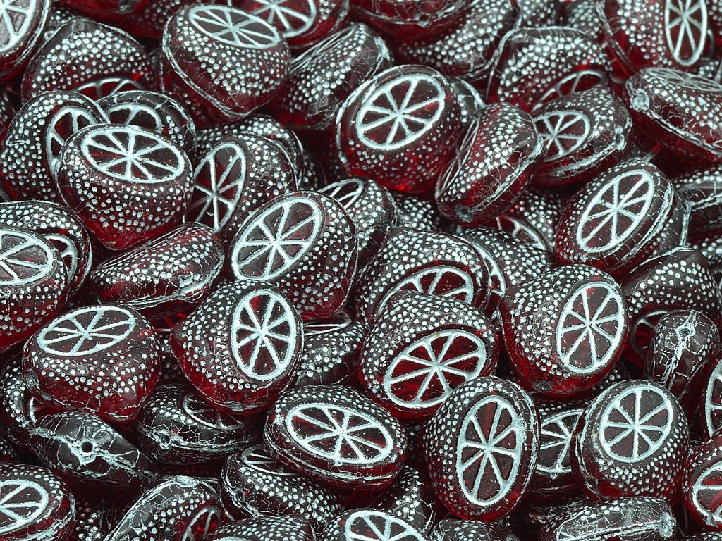 Pressed glass beads lemon shaped, size 15 mm, package contents 5 pcs or is described below, color ruby with 54201 finish.