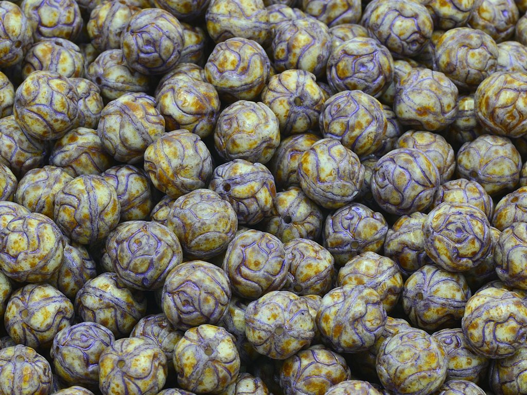 Czech pressed rose flower beads, size 10 mm, package contents 15 pcs or below, color chalk white with 86800 and 43810 finish.